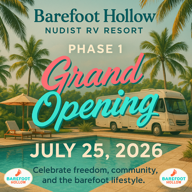 At Barefoot Hollow, we believe naturism is best experienced together. Our community is built on freedom, respect, and joy — and when you join us, you become part of a family that celebrates those values every day.